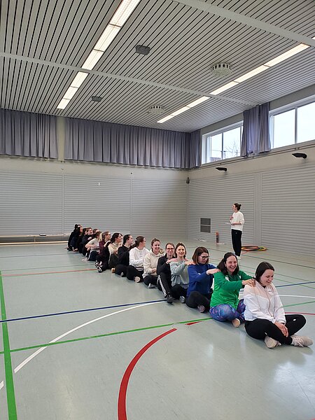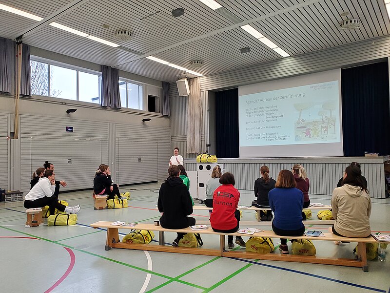 Die Bewegungspass-Multiplikatorin Katharina Guhlich, die den Tag fachlich (und auch sportlich) leitete und Ina Bauerschmidt, Projektkoordinatorin aus dem Gesundheitsamt in Waiblingen, begüßten die pädagogischen Fachkräfte und Übungsleiter/-innen herzlich, bevor es mit einem kleinen Theorie-Teil über die Hintergründe des Bewegungspasses und die Bedeutung der motorischen Entwicklung im Kindesalter losging.
